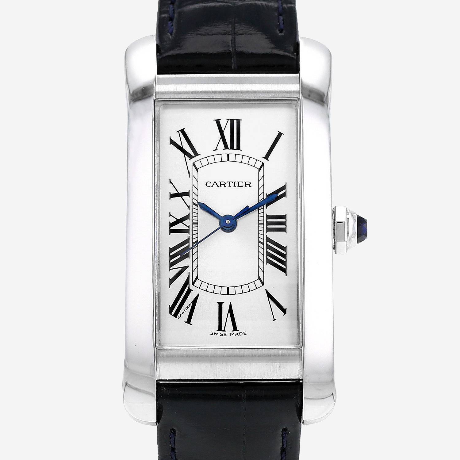 Reloj de pulsera Cartier Tank Américaine modelo mediano de acero. Caja de reloj rectangular de acero, fondo de caja enroscado, corona engastada con un cabujón de zafiro.