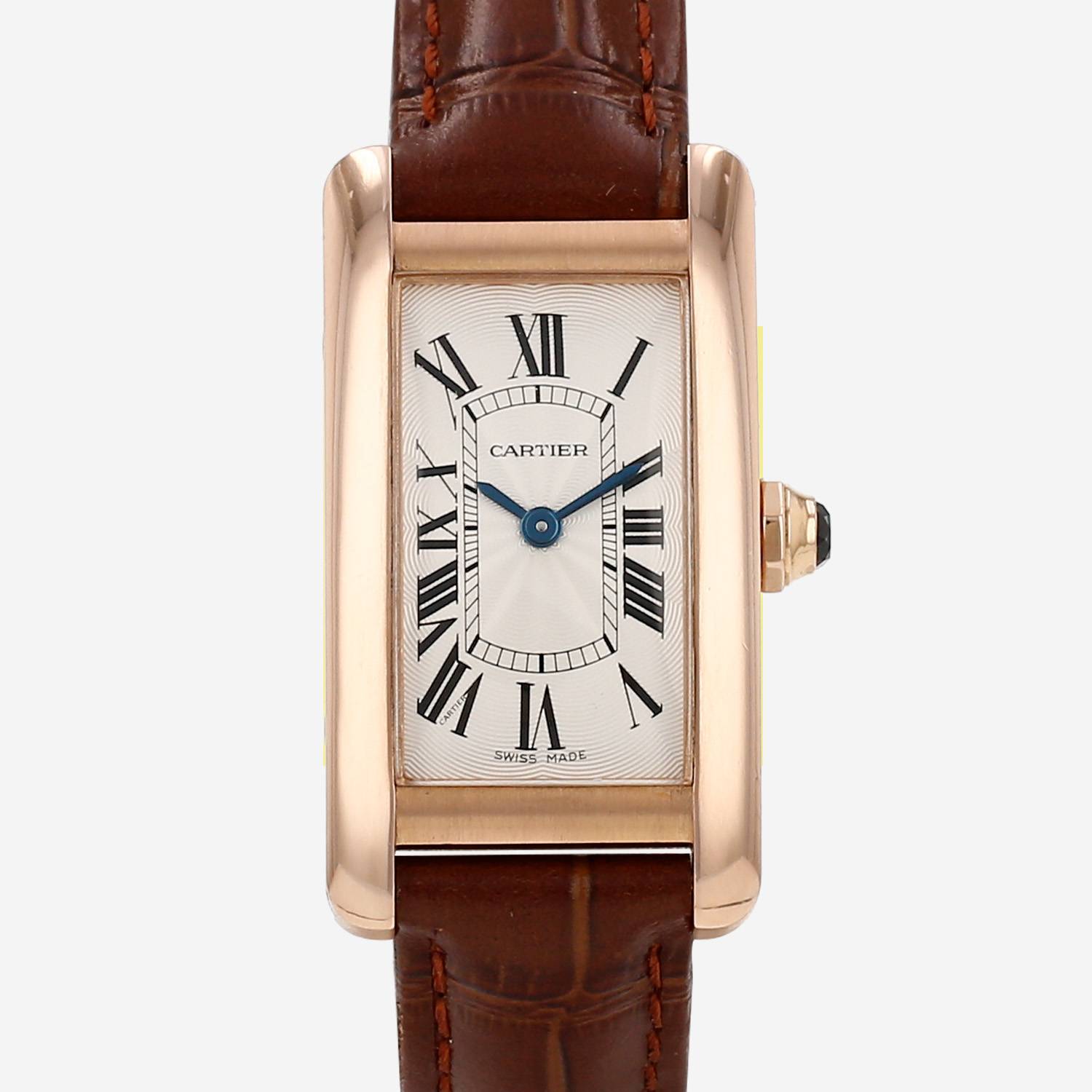 Reloj de pulsera Cartier Tank Américaine modelo pequeño de oro rosa. Caja de reloj rectangular de oro rosa, fondo de caja enroscado, corona engastada con un cabujón zafiro.