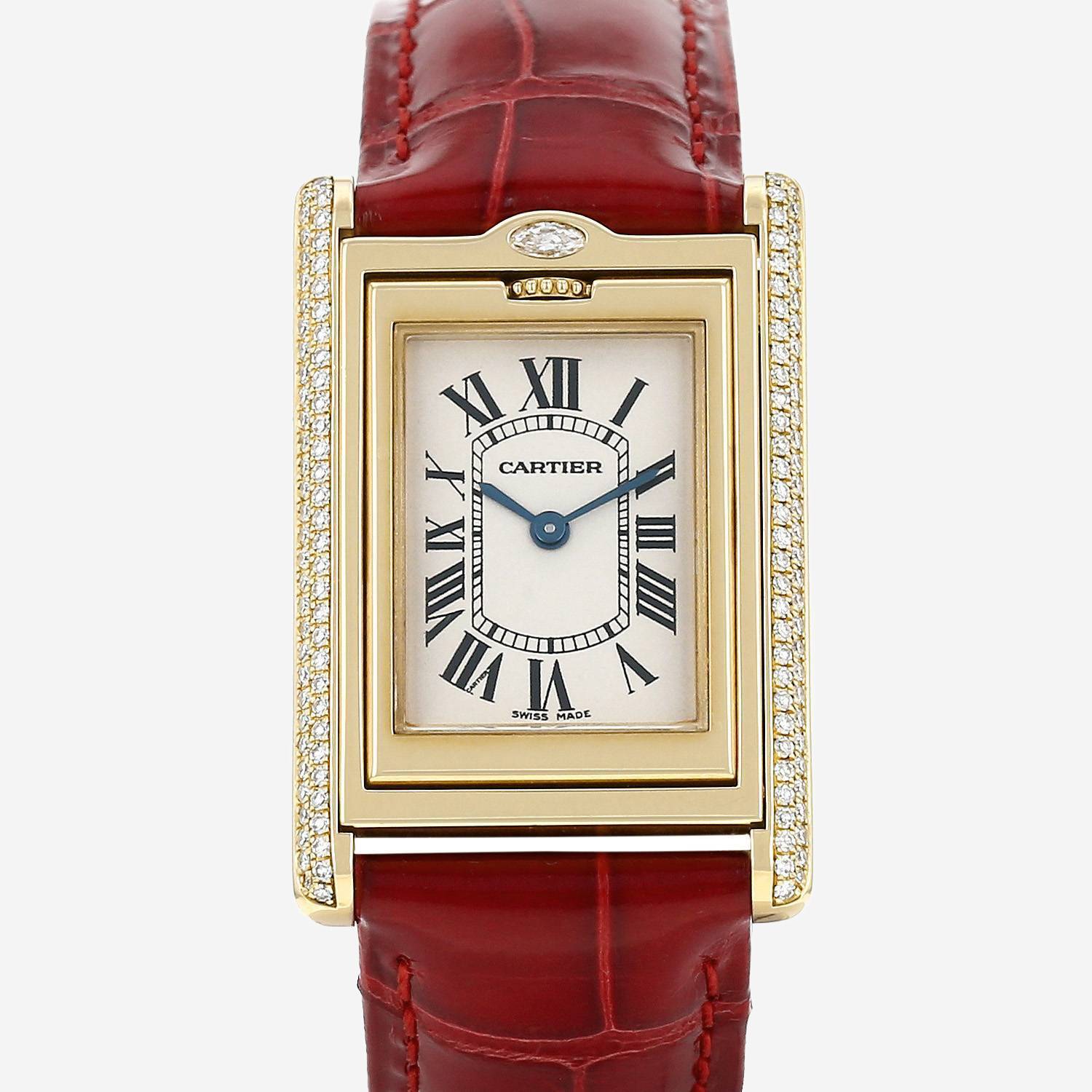 Reloj de pulsera Cartier Tank Basculante de oro amarillo. Caja de reloj rectangular de oro amarillo engastada con diamantes reversible, fondo de caja enroscado, corona acanalada integrado en la caja de reloj.