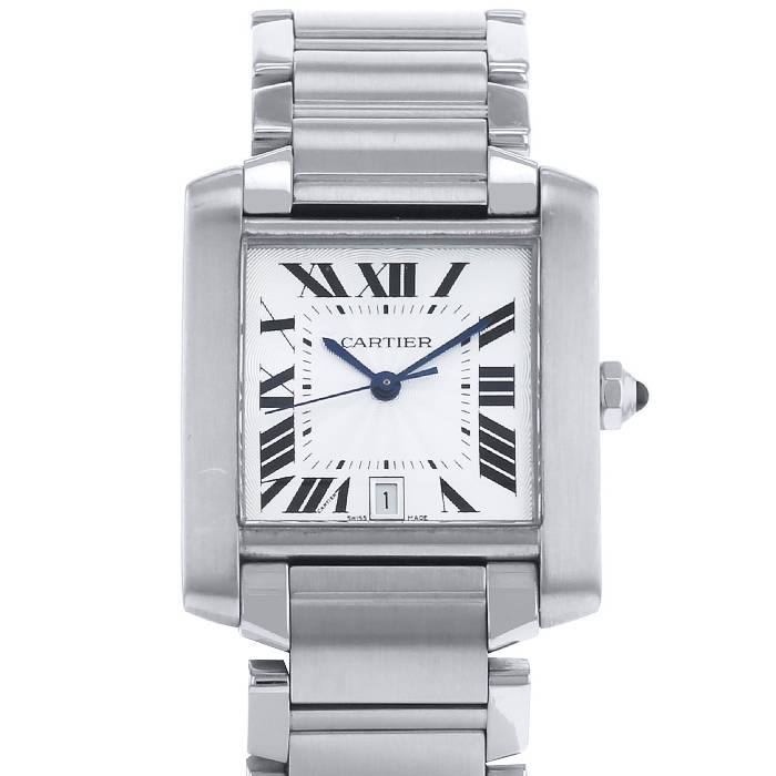 Reloj de pulsera Cartier Tank Française de acero. Caja de reloj rectangular de acero, fondo de caja enroscado, corona acanalada engastada con un cabujón de zafiro.