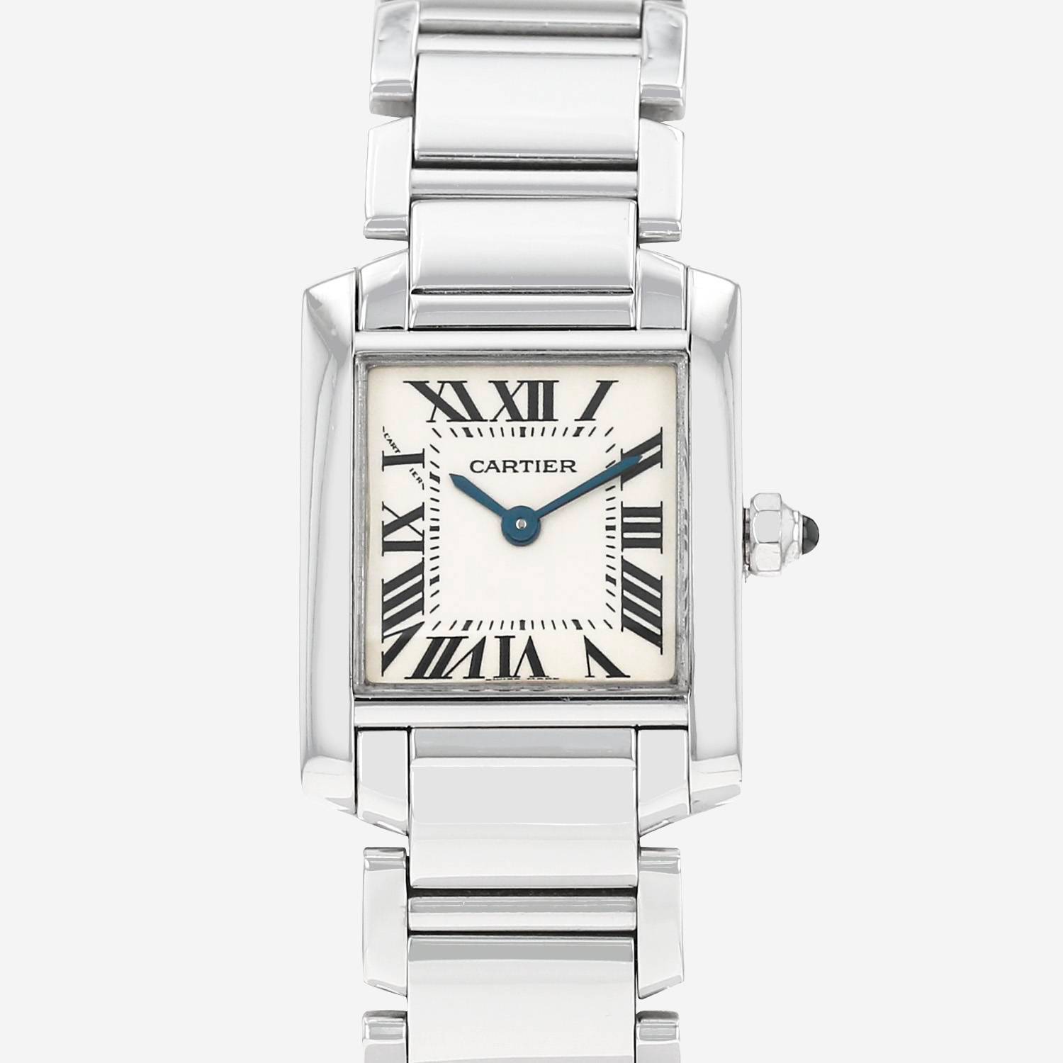 Reloj de pulsera Cartier Tank Française de oro blanco. Caja de reloj cuadrada de oro blanco, fondo de caja enroscado, corona acanalada engastada con un cabujón zafiro.