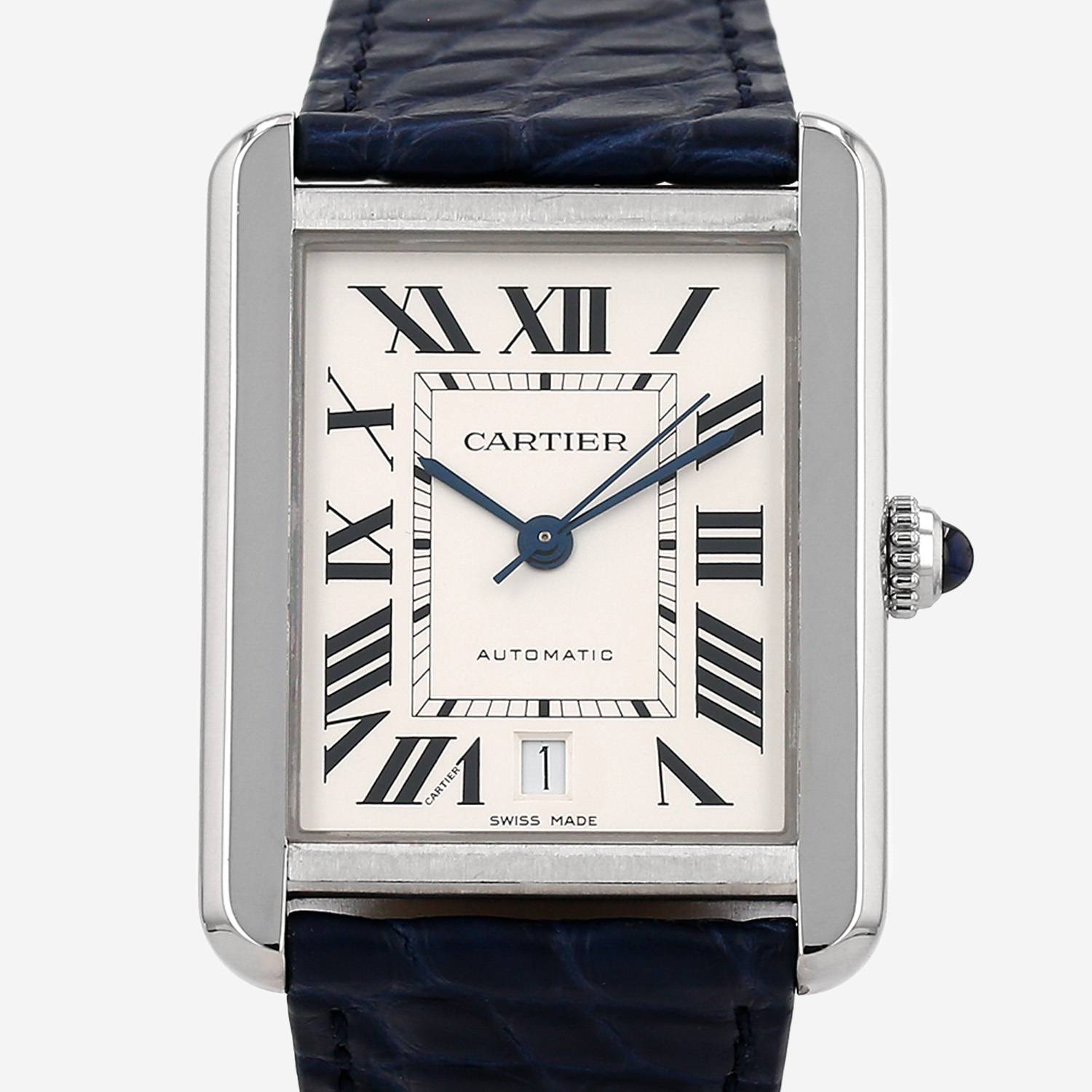 Reloj de pulsera Cartier Tank Solo modelo grande de acero. Caja de reloj rectangular de acero, fondo de caja enroscado, corona acanalada engastada con un cabujón zafiro.