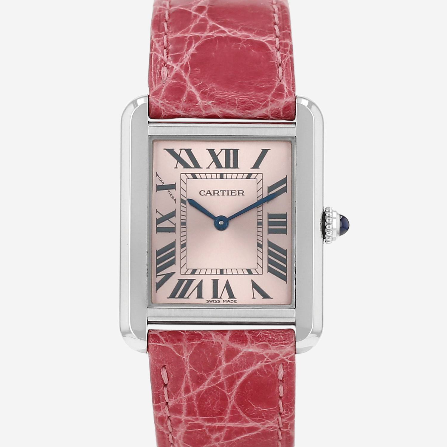 Reloj de pulsera Cartier Tank modelo mediano de acero. Caja de reloj rectangular de acero, fondo de caja enroscado, corona acanalada engastada con un cabujón zafiro.