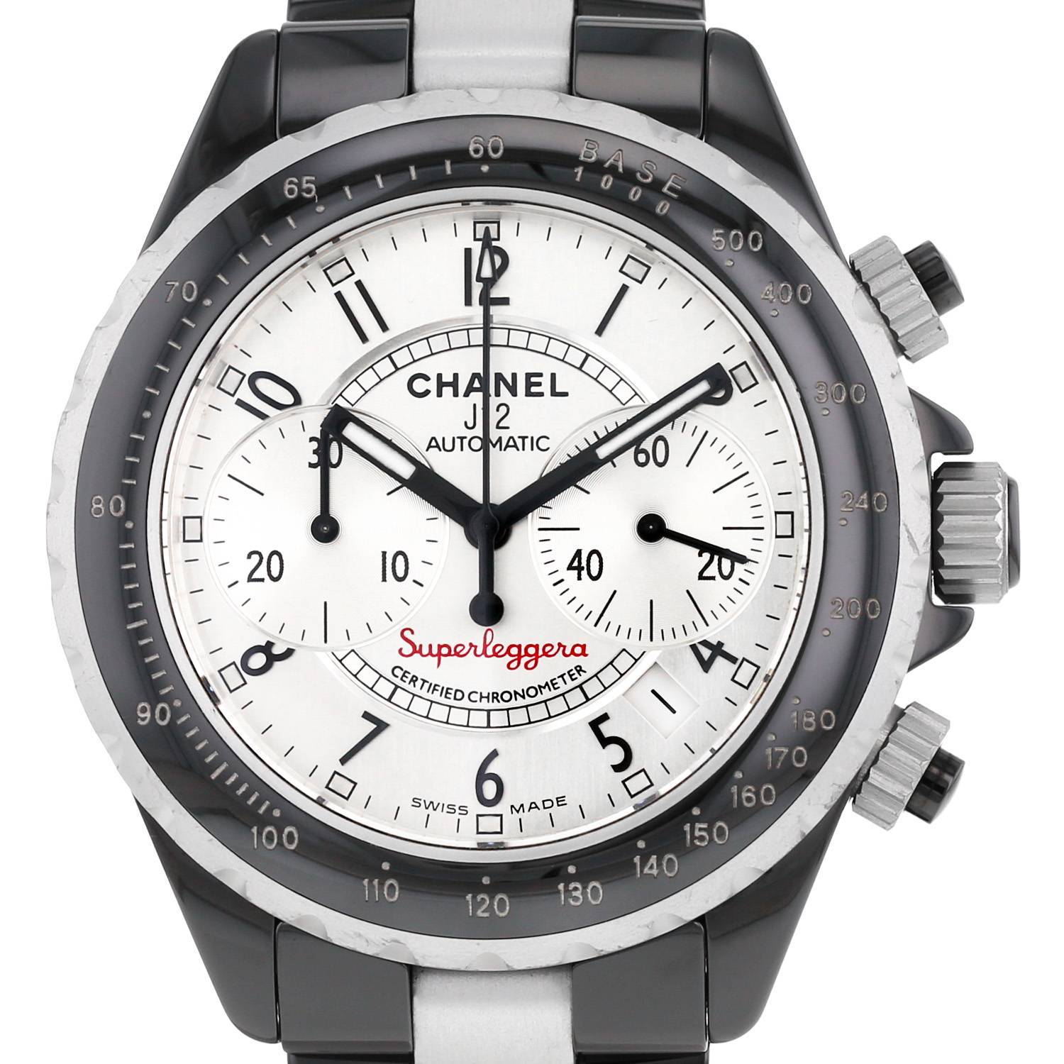 Reloj de pulsera Chanel J12 Chronographe de cerámica y acero. Caja de reloj redonda de cerámica, fondo de caja enroscado, , a las 2h y a las 4h, bisel graduado, corona acanalada engastada con un cabujón negro.