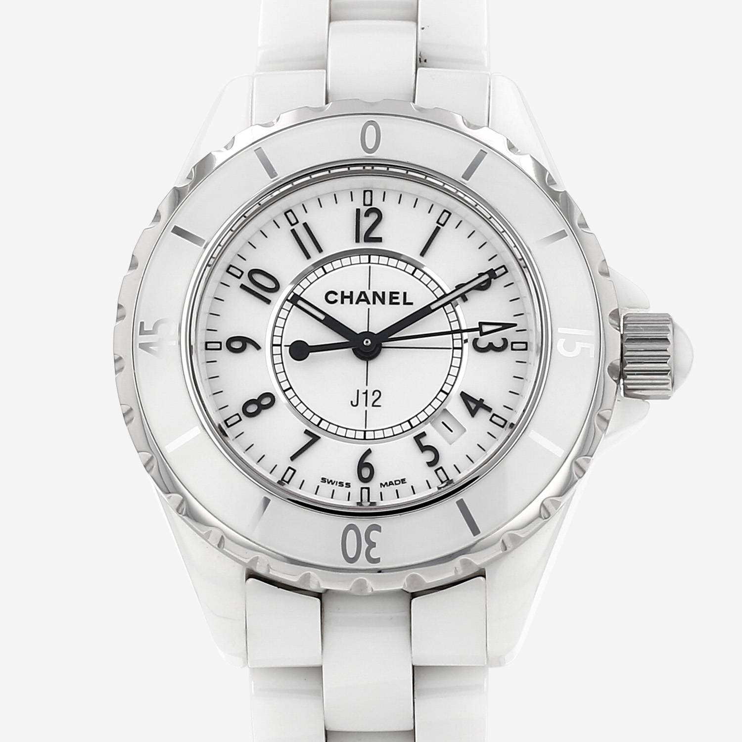 Reloj de pulsera Chanel J12 de cerámica blanca y acero. Caja de reloj redonda de cerámica, fondo de caja enroscado, bisel graduado giratorio unidireccional, corona enroscada engastada con un cabujón.