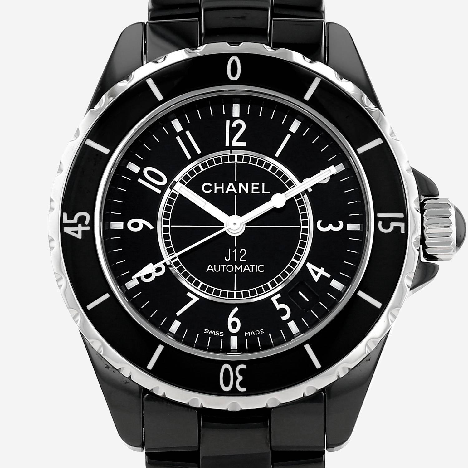 Reloj de pulsera Chanel J12 de cerámica negra y acero. Caja de reloj redonda de acero, fondo de caja enroscado, bisel graduado giratorio unidireccional, corona enroscada engastada con un cabujón negro.