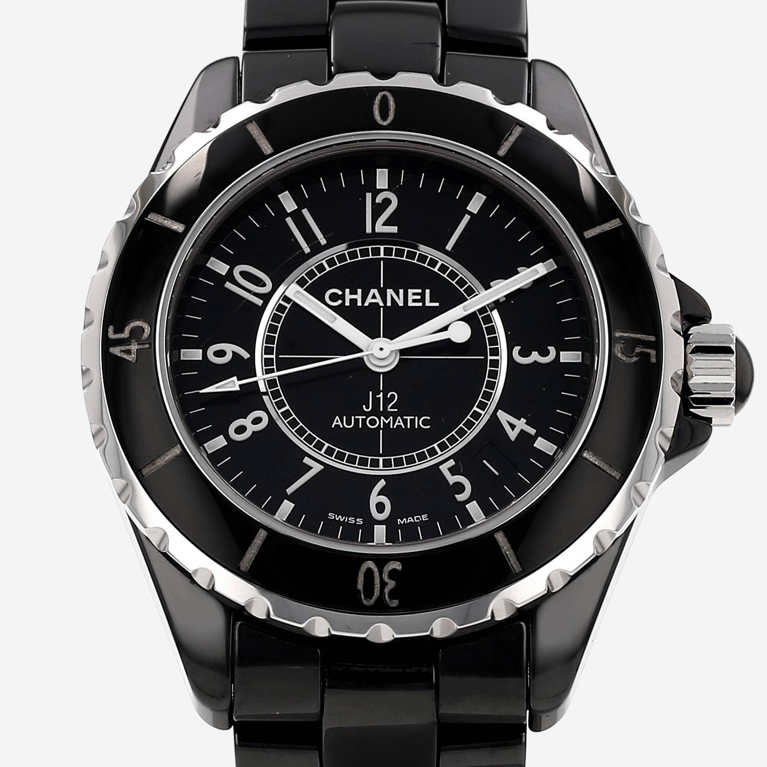 Reloj de pulsera Chanel J12 de cerámica negra y acero. Caja de reloj redonda de cerámica, fondo de caja enroscado, bisel graduado giratorio unidireccional, corona enroscada engastada con un cabujón.
