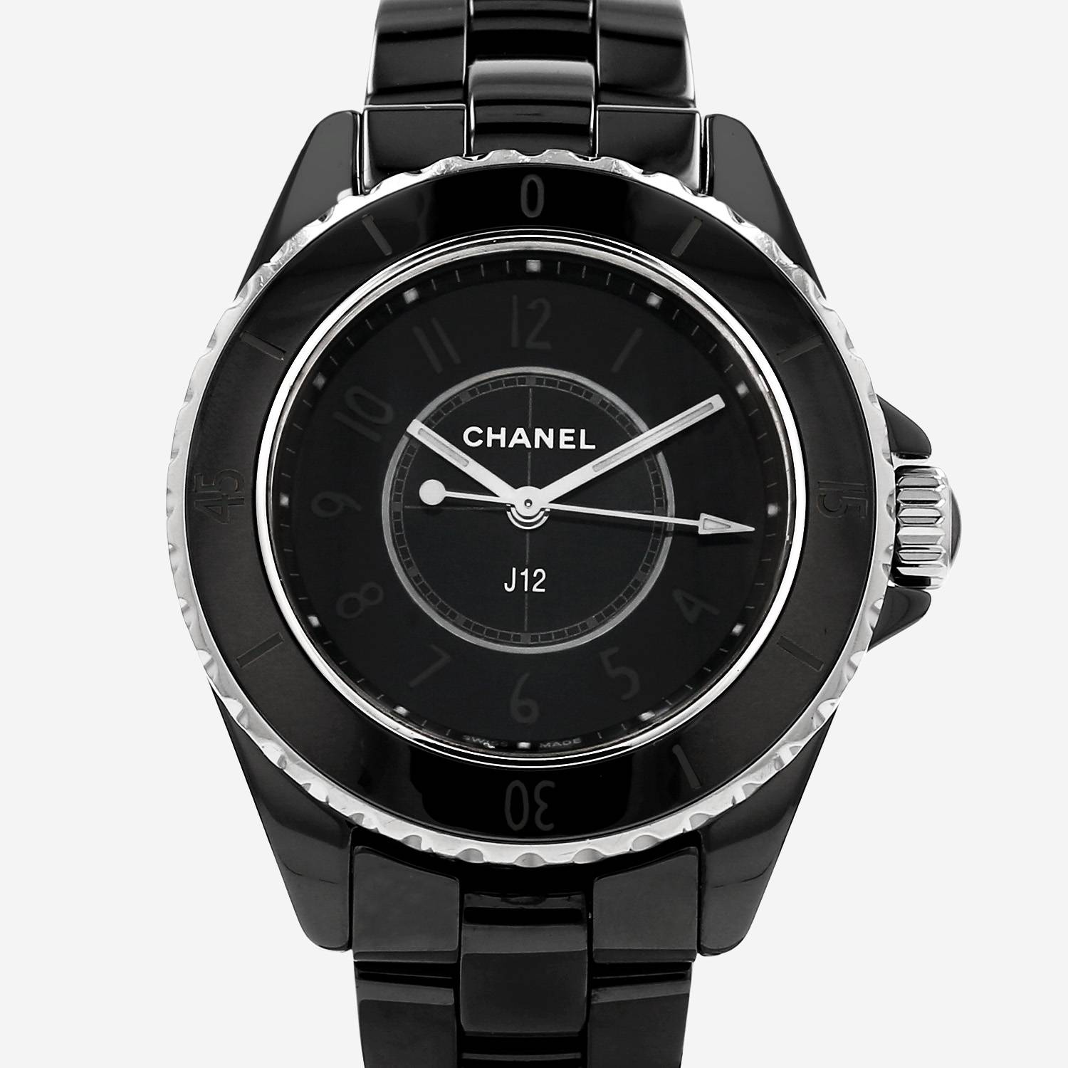 Reloj de pulsera Chanel J12 de cerámica negra y acero. Caja de reloj redonda de acero, fondo de caja enroscado, bisel graduado giratorio unidireccional, corona enroscada engastada con un cabujón negro.