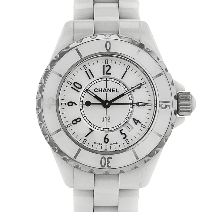 Bonito reloj de pulsera Chanel J12 de cerámica blanca. Caja de reloj redonda de cerámica, fondo de caja enroscado, bisel graduado giratorio, corona enroscada engastada con un cabujón blanco.