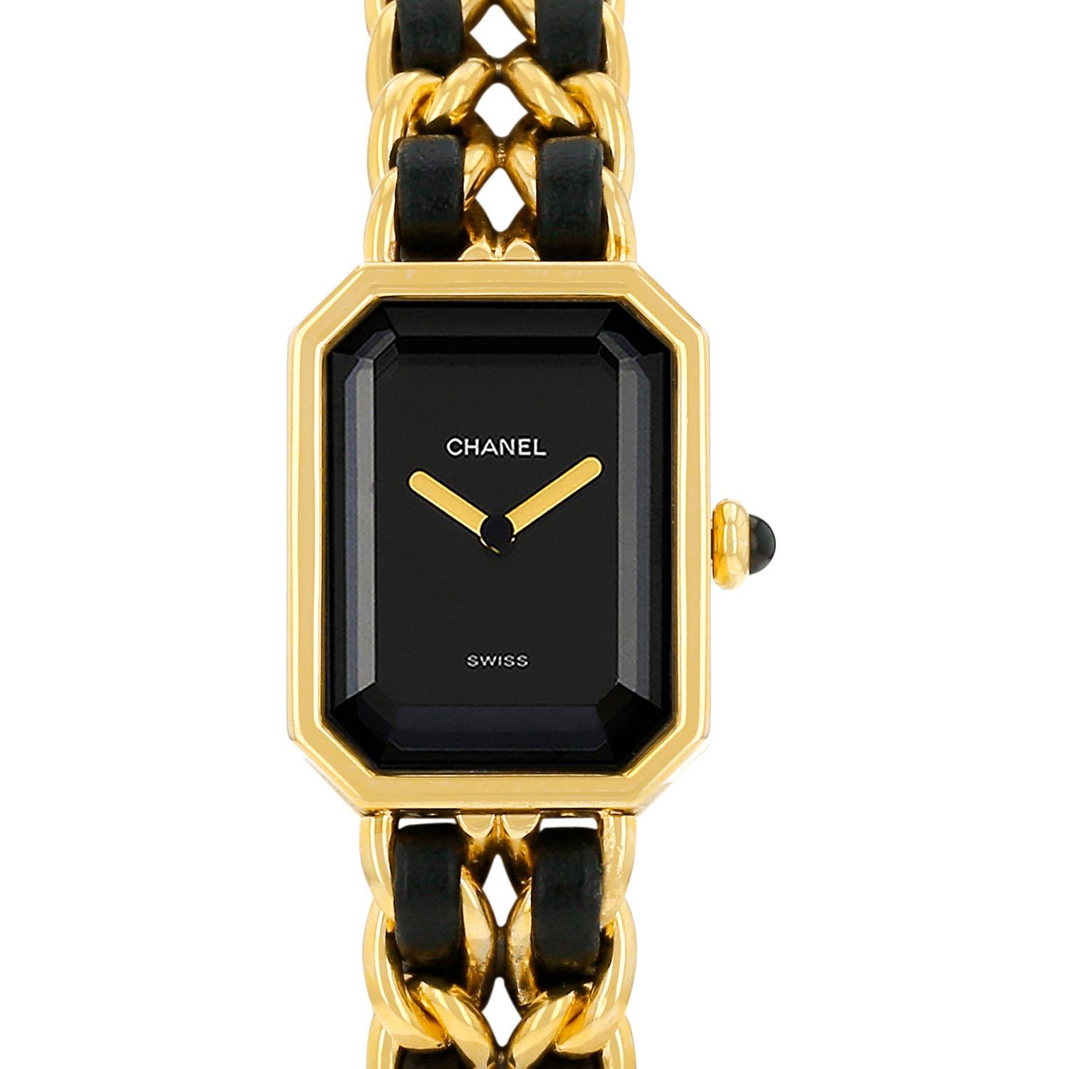 Reloj de pulsera Chanel Première talla L de oro chapado. Caja de reloj octogonal de oro chapado con vidrio facetado, fondo de caja con clip, corona engastada con un cabujón negro.