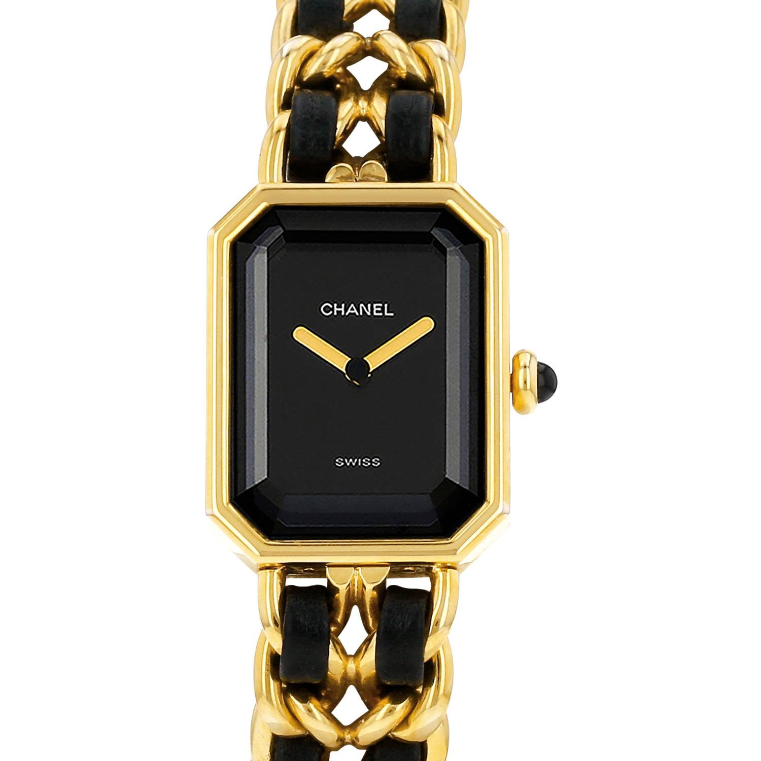 Reloj de pulsera Chanel Première talla L de oro chapado. Caja de reloj octogonal de oro chapado con vidrio facetado, fondo de caja con clip, corona engastada con un cabujón negro.
