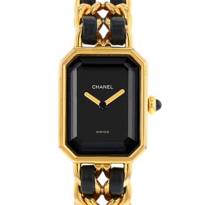 Reloj de pulsera Chanel Première talla M de oro chapado. Caja de reloj octogonal de oro chapado con vidrio facetado, fondo de caja con clip, corona engastada con un cabujón negro.