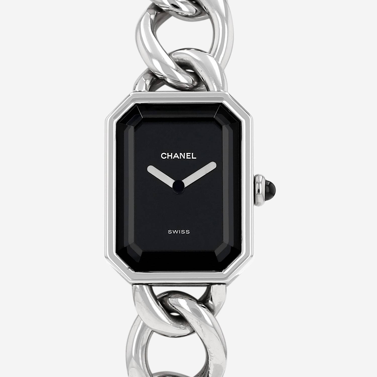 Reloj de pulsera Chanel Première talla XL de acero. Caja de reloj octogonal de acero con vidrio facetado, fondo de caja enroscado, corona engastada con un cabujón negro.