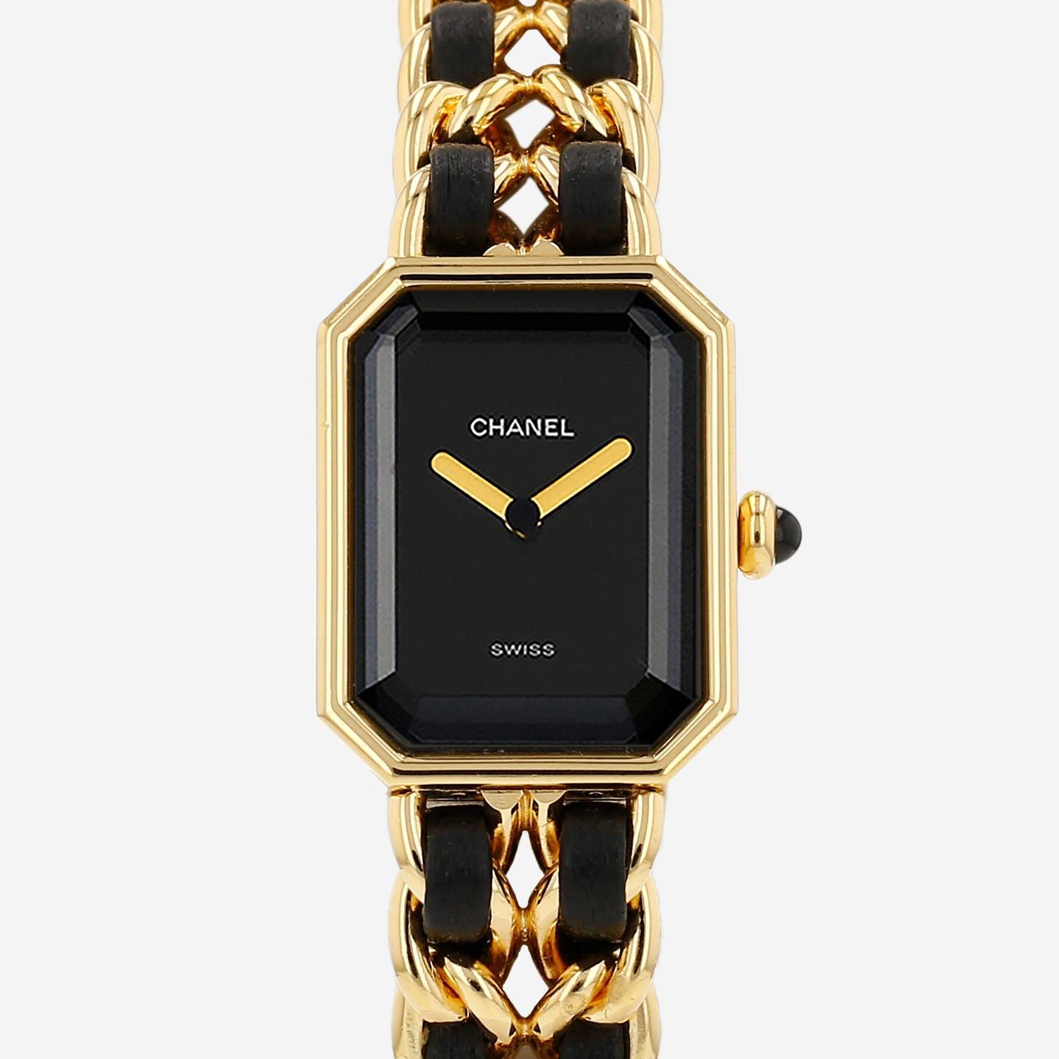 Reloj de pulsera Chanel Première talla XL de oro chapado. Caja de reloj octogonal de oro chapado con vidrio facetado, fondo de caja con clip, corona engastada con un cabujón negro.