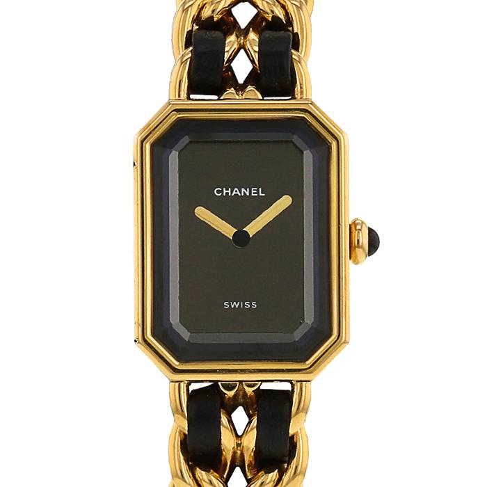 Reloj de pulsera para mujer Chanel Première talla L de oro chapado. Caja de reloj rectangular de oro chapado con vidrio facetado, corona engastada con un cabujón negro.