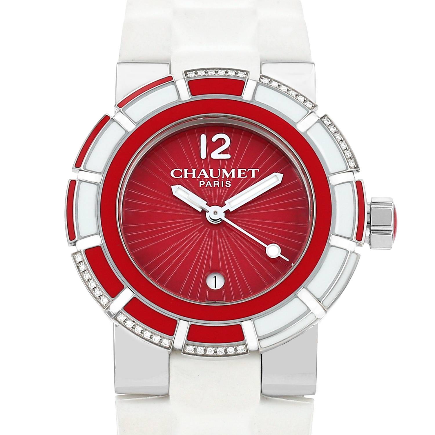 - Brazalete de caucho blanco con firma Chaumet, doble hebilla desplegable de acero con firma Chaumet.