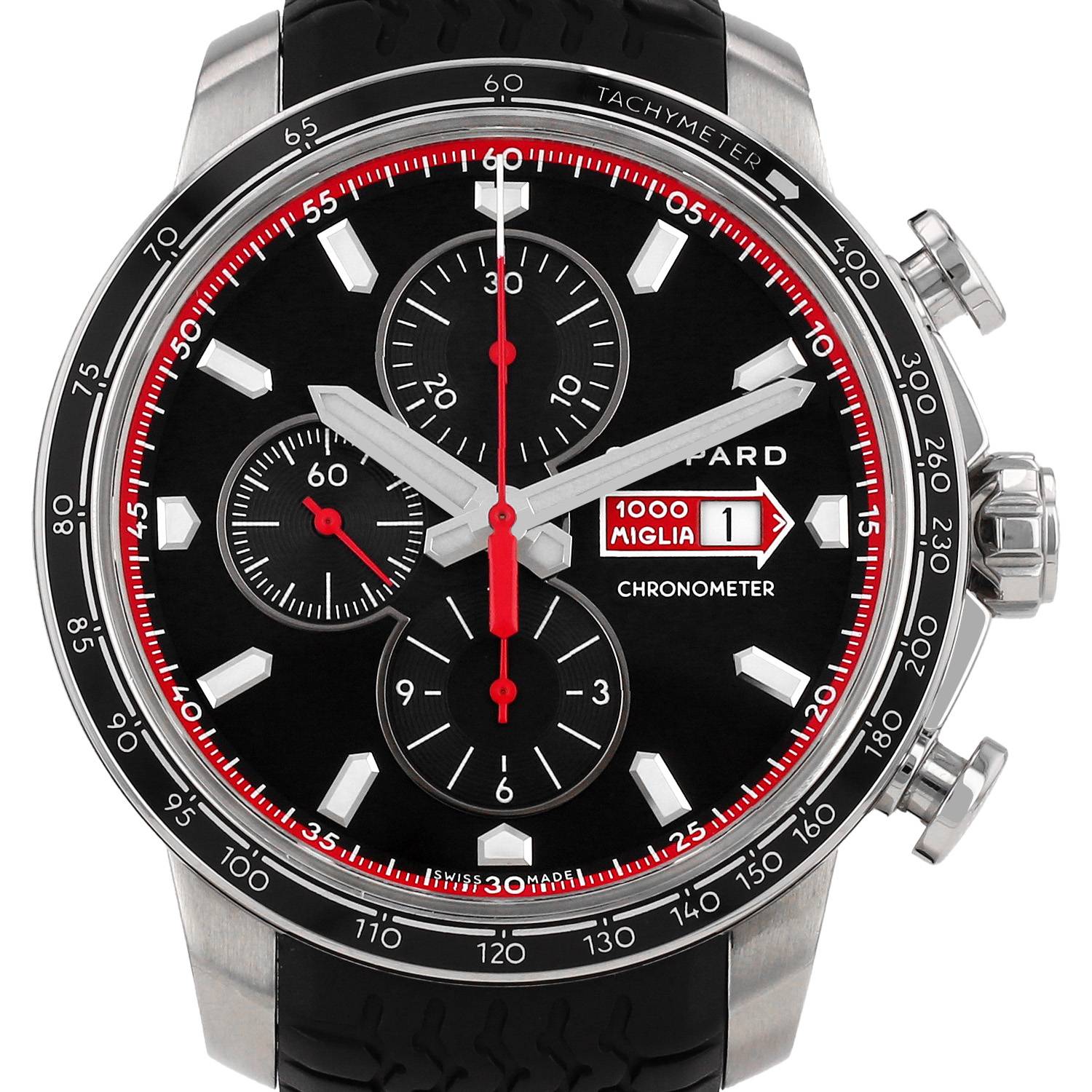 Reloj de pulsera Chopard Mille Miglia de acero. Caja de reloj redonda de acero, fondo de caja enroscado, pulsadores bombas, a las 2h y a las 4h, bisel graduado escala taquimétrica, corona enroscada.