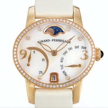 GIRARD-PERREGAUX - A LADY'S PINK GOLD AND DIAMOND-SET OVAL AUTOMATIC WRISTWATCH WITH MOON-PHASES, DATE, RETROGRADE SECONDS AND DAY AND MOTHER-OF-PEARL DIAL CIRCA 2008 CAT'S EYE BI-RETRO