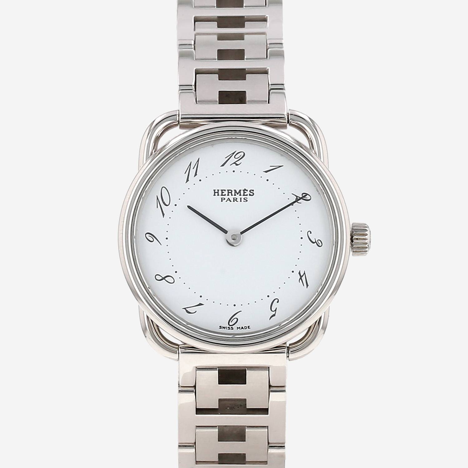 Reloj de pulsera Hermès Arceau de acero. Caja de reloj redonda de acero, fondo de caja con clip, corona acanalada.