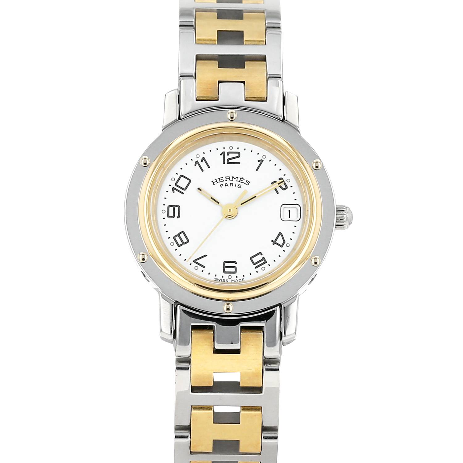 Reloj de pulsera Hermès Clipper de acero y oro chapado. Caja de reloj redonda de acero, fondo de caja con clip, corona acanalada.
