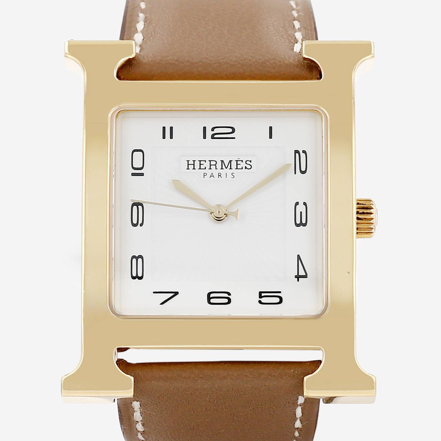 Reloj de pulsera Hermès Heure H de oro chapado y acero. Caja de reloj en forma de H de oro chapado, fondo de caja enroscado, corona acanalada.