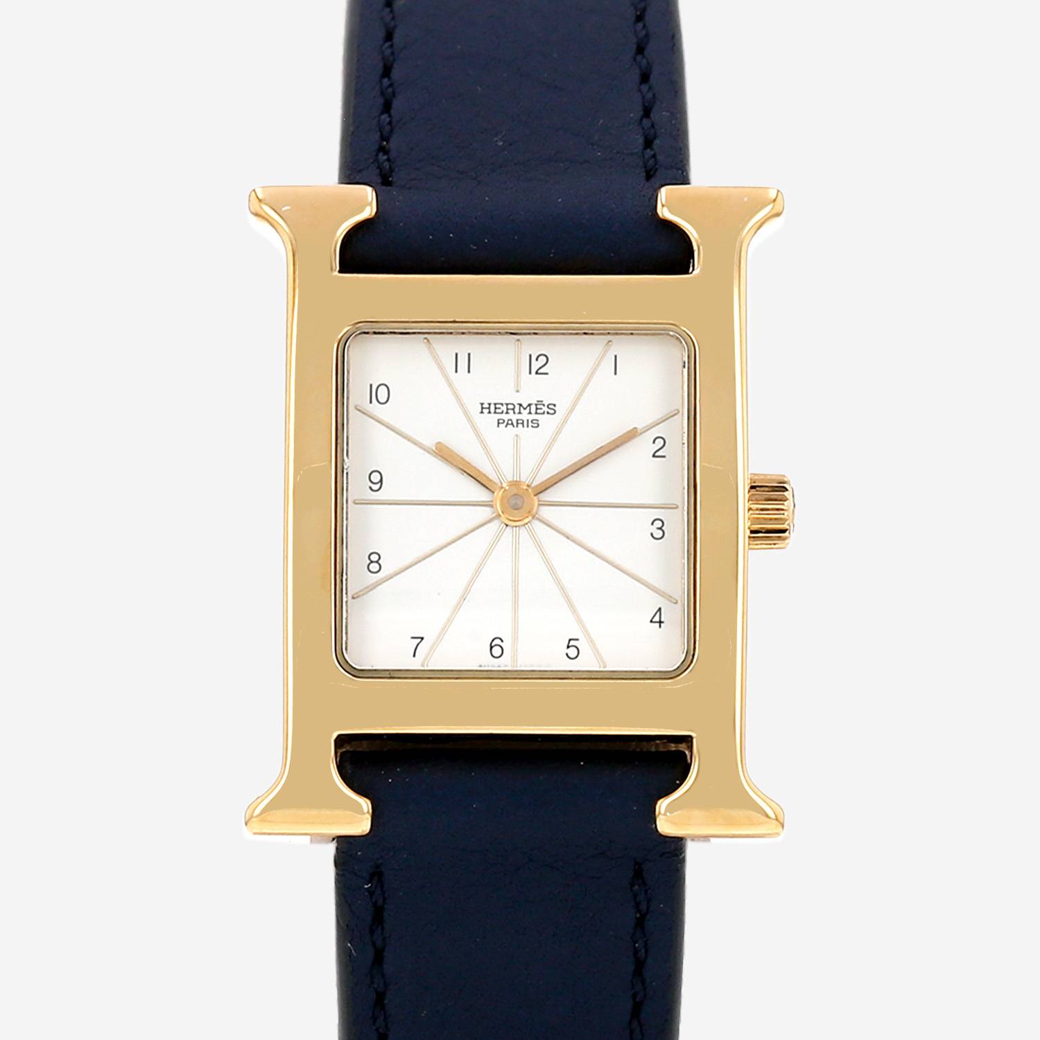 Reloj de pulsera Hermès Heure H de oro chapado y acero. Caja de reloj en forma de H de oro chapado, fondo de caja enroscado, corona acanalada.