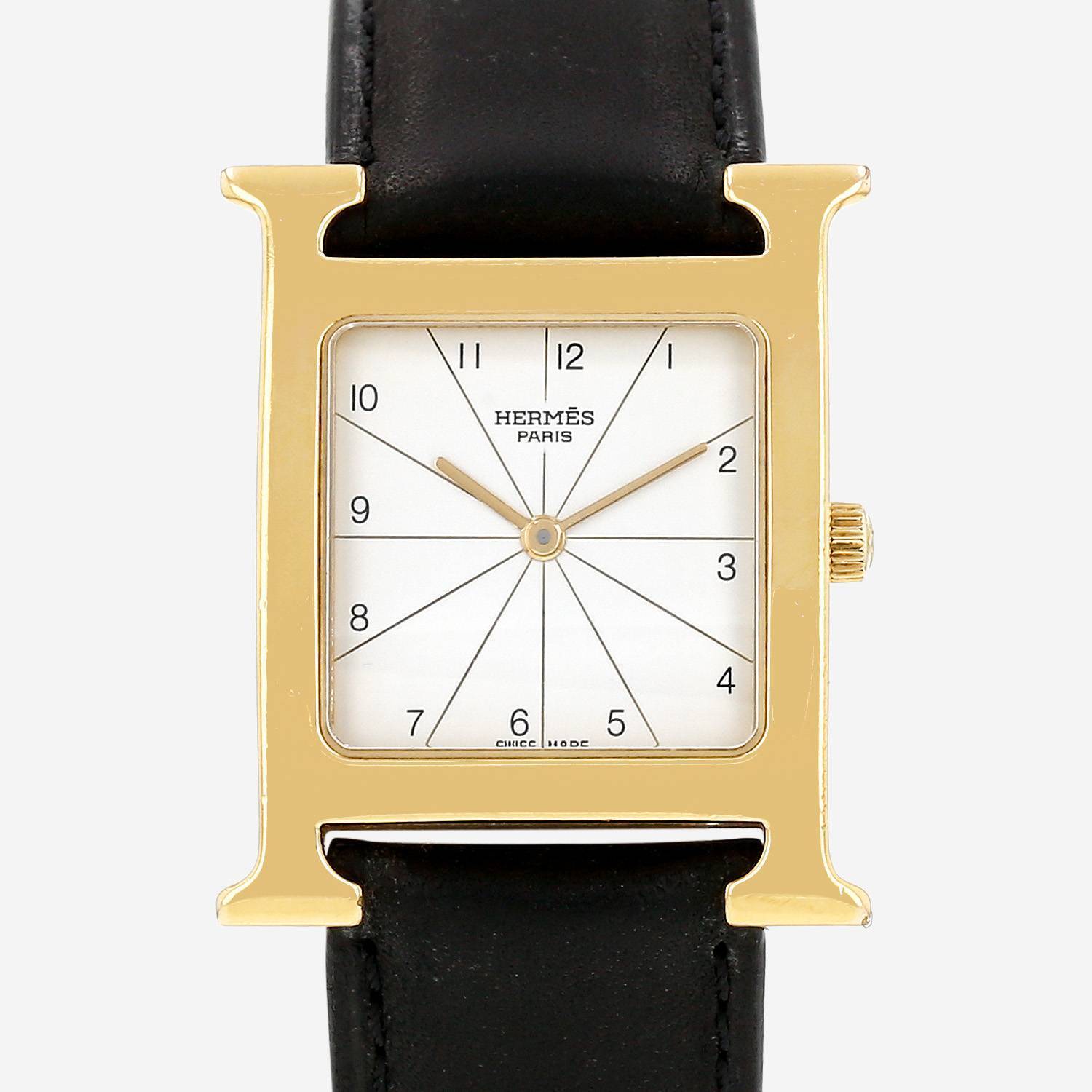 Reloj de pulsera Hermès Heure H de oro chapado y acero. Caja de reloj en forma de H de oro chapado, fondo de caja enroscado, corona acanalada.