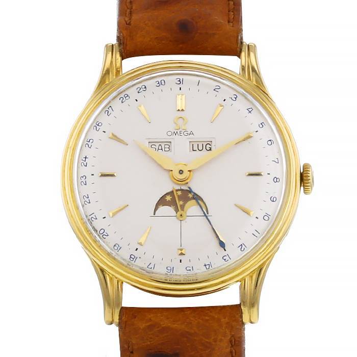 Reloj de pulsera Omega Cosmic Moonphase de oro amarillo. Caja de reloj redonda de oro amarillo, fondo de caja con clip, corona acanalada.