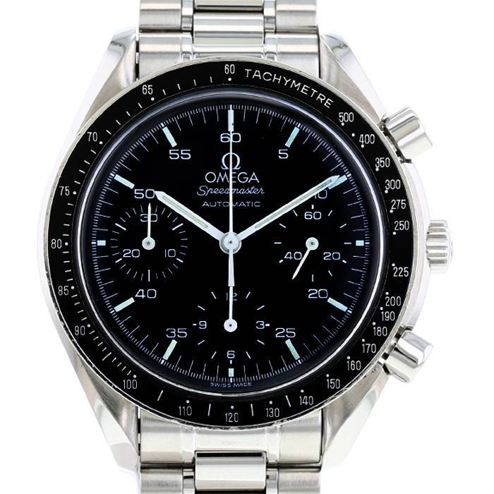 Reloj de pulsera Omega Speedmaster Automatic de acero. Caja de reloj redonda de acero, fondo de caja con clip, bisel graduado escala taquimétrica, corona acanalada.