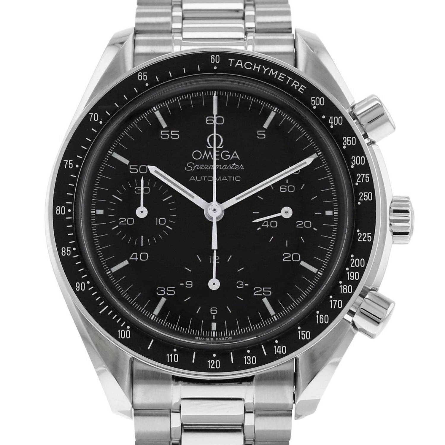 Reloj de pulsera Omega Speedmaster Automatic de acero. Caja de reloj redonda de acero, fondo de caja con clip, pulsadores lisos, a las 2h y a las 4h, bisel taquímetro de acero, corona acanalada.