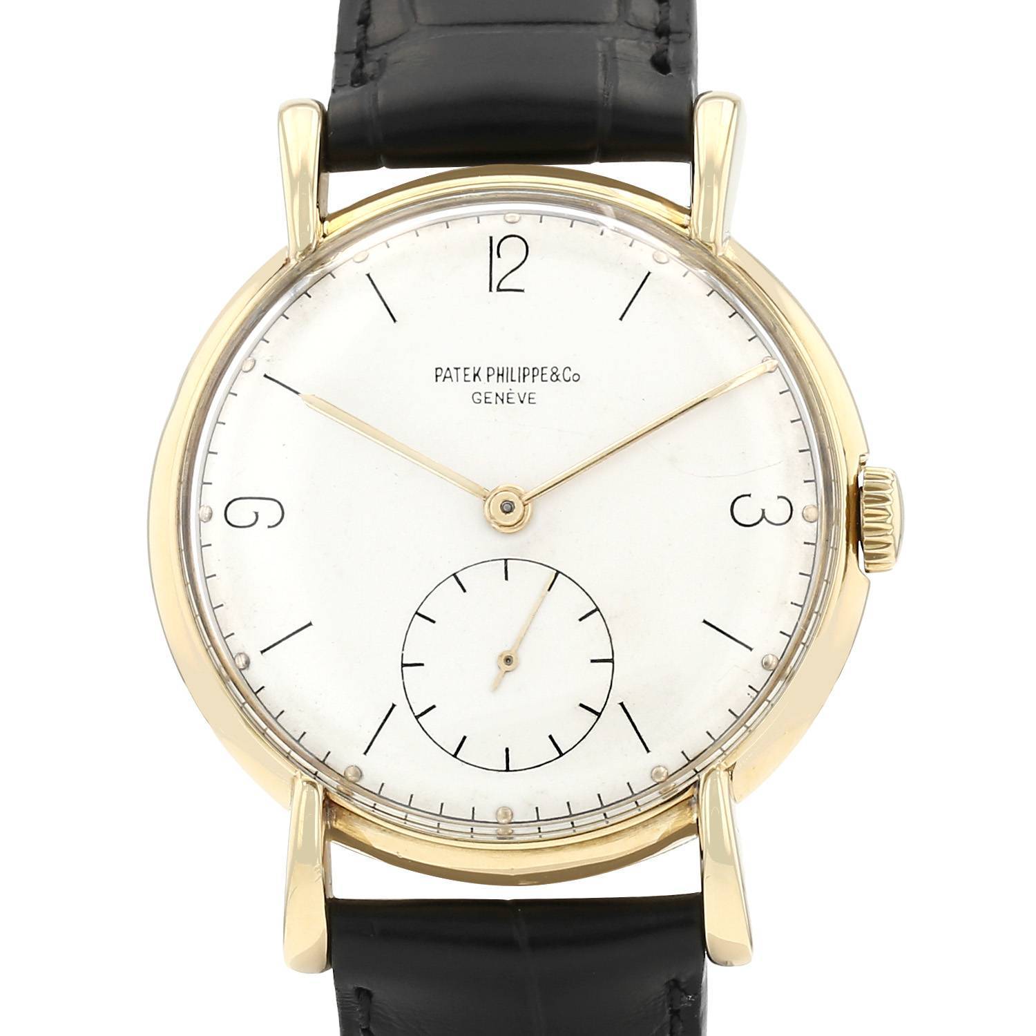 Reloj de pulsera Patek Philippe Calatrava de oro amarillo. Caja de reloj redonda de oro amarillo, fondo de caja con clip, corona acanalada.