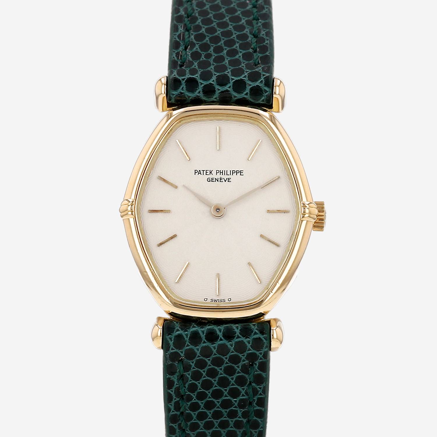 Reloj de pulsera Patek Philippe Ellipse de oro amarillo. Caja de reloj de oro amarillo, fondo de caja con clip, corona acanalada.