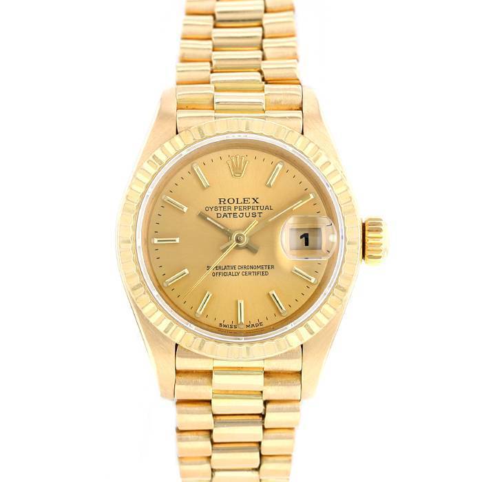 Reloj de pulsera Rolex Datejust Lady de oro amarillo. Caja de reloj redonda de oro amarillo, fondo de caja enroscado, bisel estriado de oro amarillo, corona enroscada.