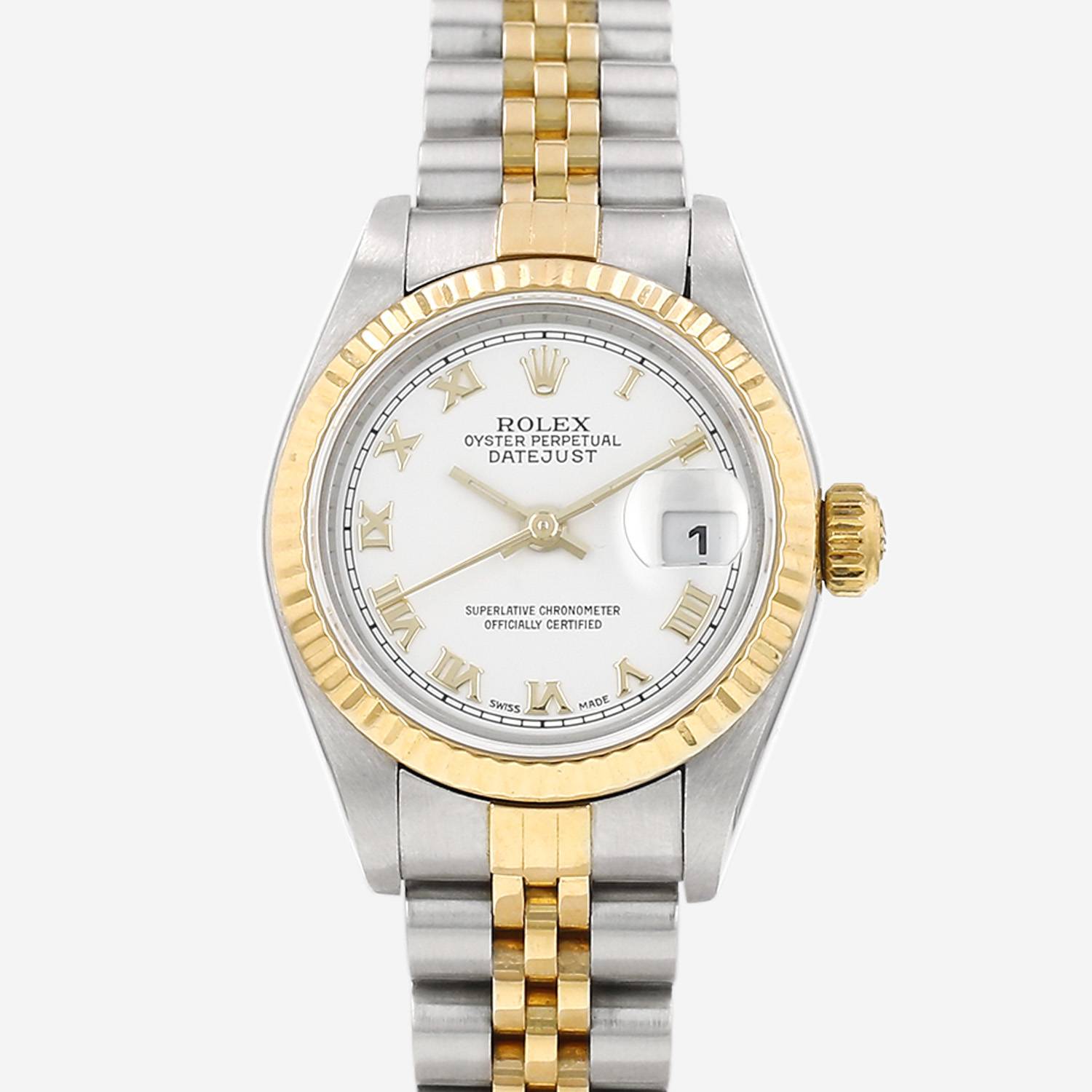Reloj de pulsera Rolex Datejust Lady de oro y acero. Caja de reloj redonda de oro y acero, fondo de caja enroscado, bisel estriado de oro amarillo, corona enroscada.