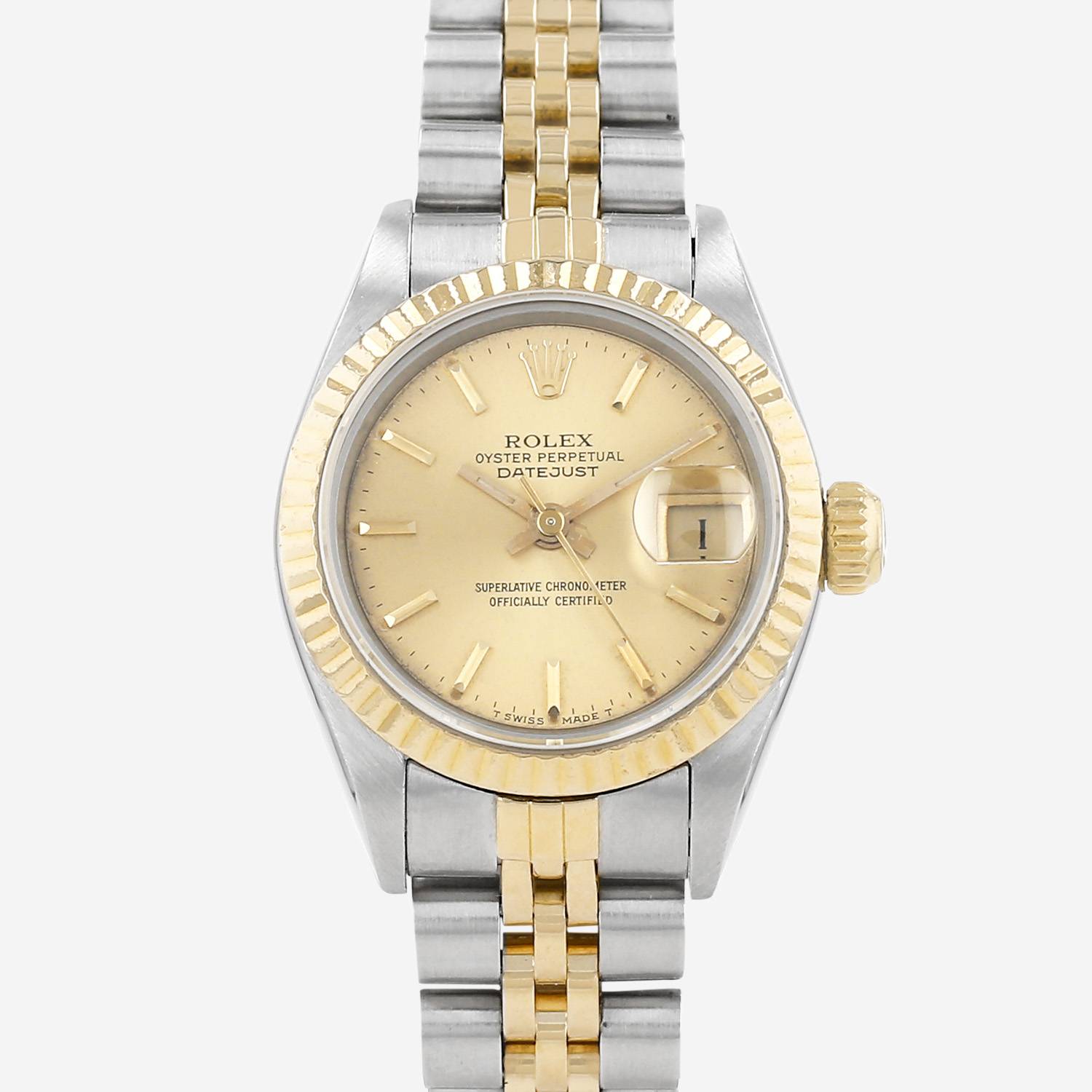Reloj de pulsera Rolex Datejust Lady de oro y acero. Caja de reloj redonda de oro y acero, fondo de caja enroscado, bisel estriado de oro amarillo, corona enroscada.