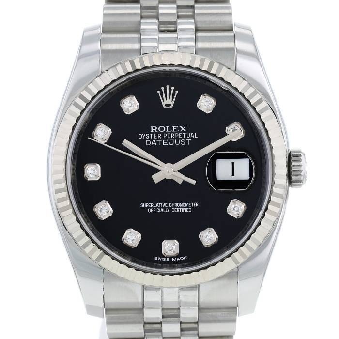 Reloj de pulsera Rolex Datejust de acero. Caja de reloj redonda de acero, fondo de caja enroscado, bisel estriado de oro blanco, corona enroscada.