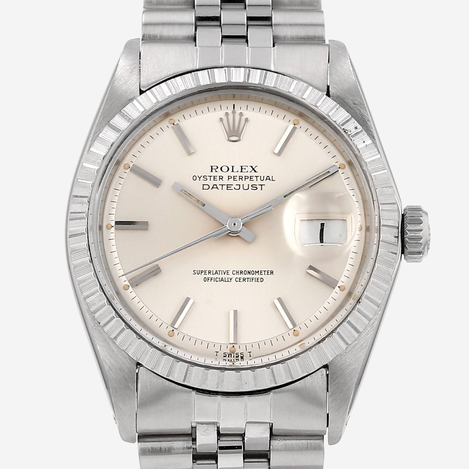 Reloj de pulsera Rolex Datejust de acero. Caja de reloj redonda de acero, fondo de caja enroscado, bisel estriado de acero, corona enroscada.