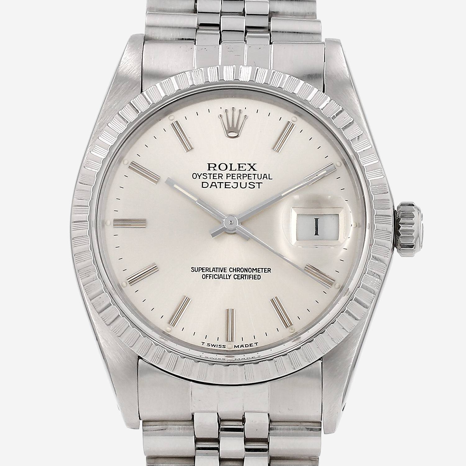 Reloj de pulsera Rolex Datejust de acero. Caja de reloj redonda de acero, fondo de caja enroscado, bisel estriado de acero, corona enroscada.