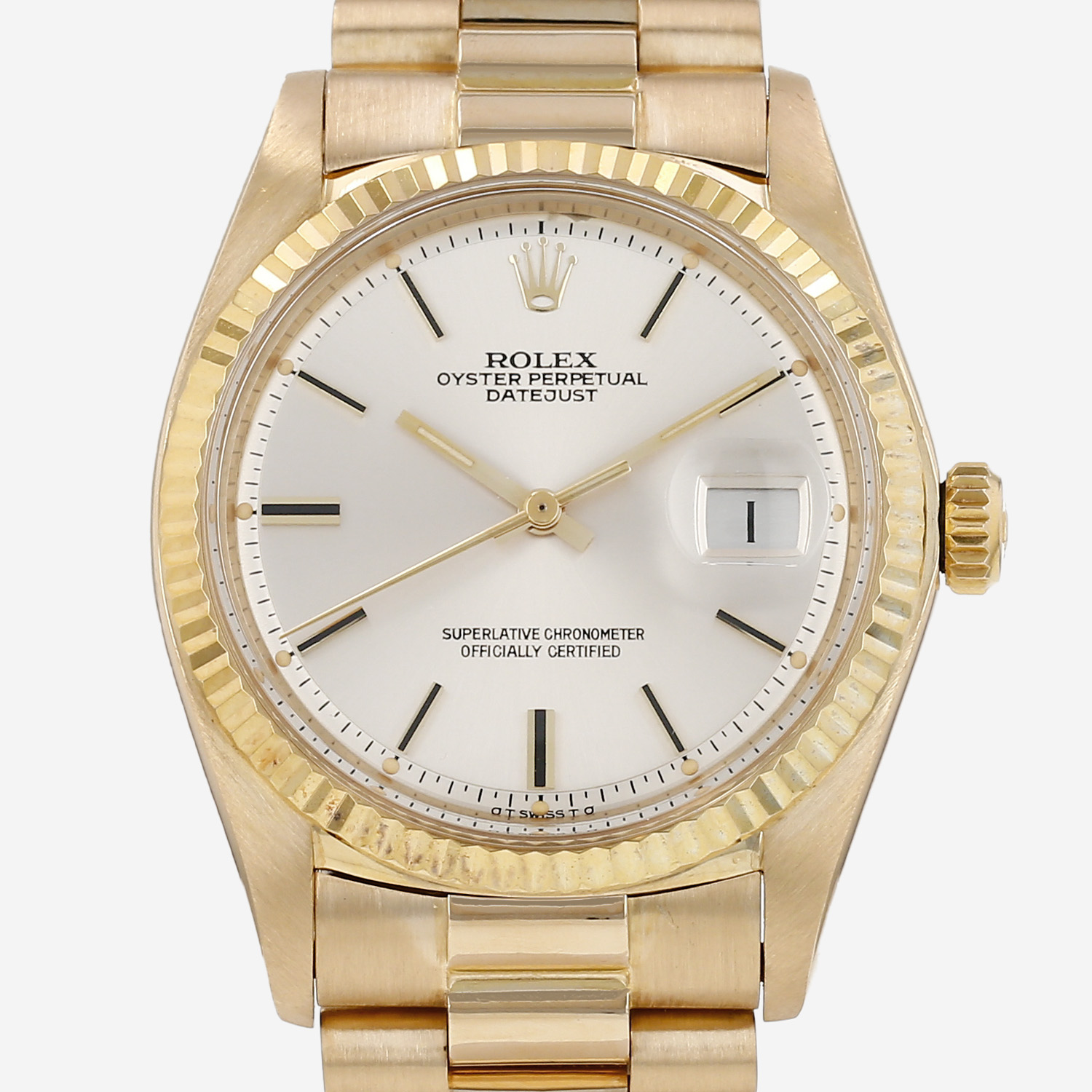 Reloj de pulsera Rolex Datejust de oro amarillo. Caja de reloj redonda de oro amarillo, fondo de caja enroscado, bisel estriado de oro amarillo, corona enroscada.