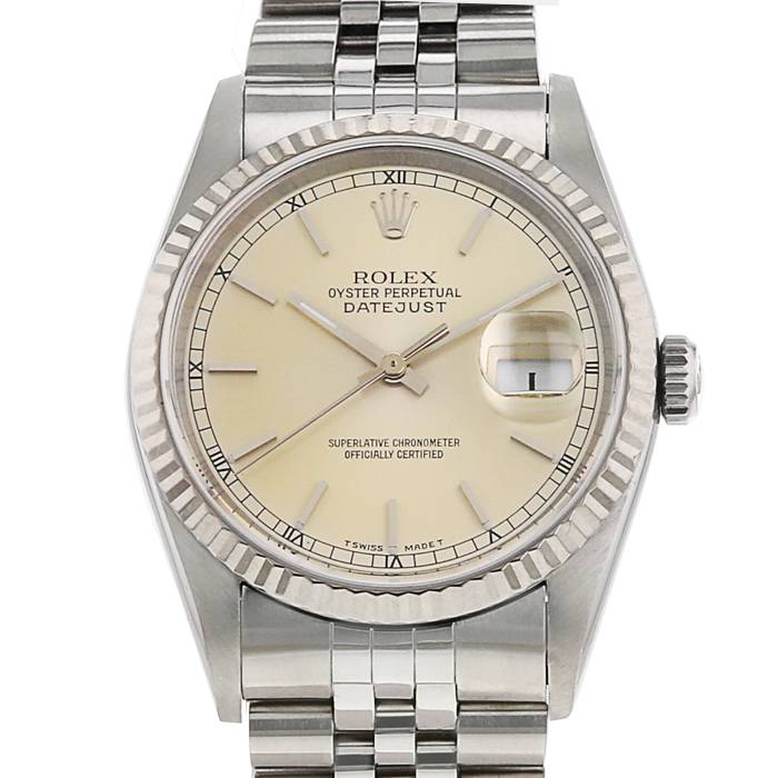 Reloj de pulsera Rolex Datejust de oro y acero. Caja de reloj redonda de acero, fondo de caja enroscado, bisel estriado de oro blanco 14k, corona enroscada.