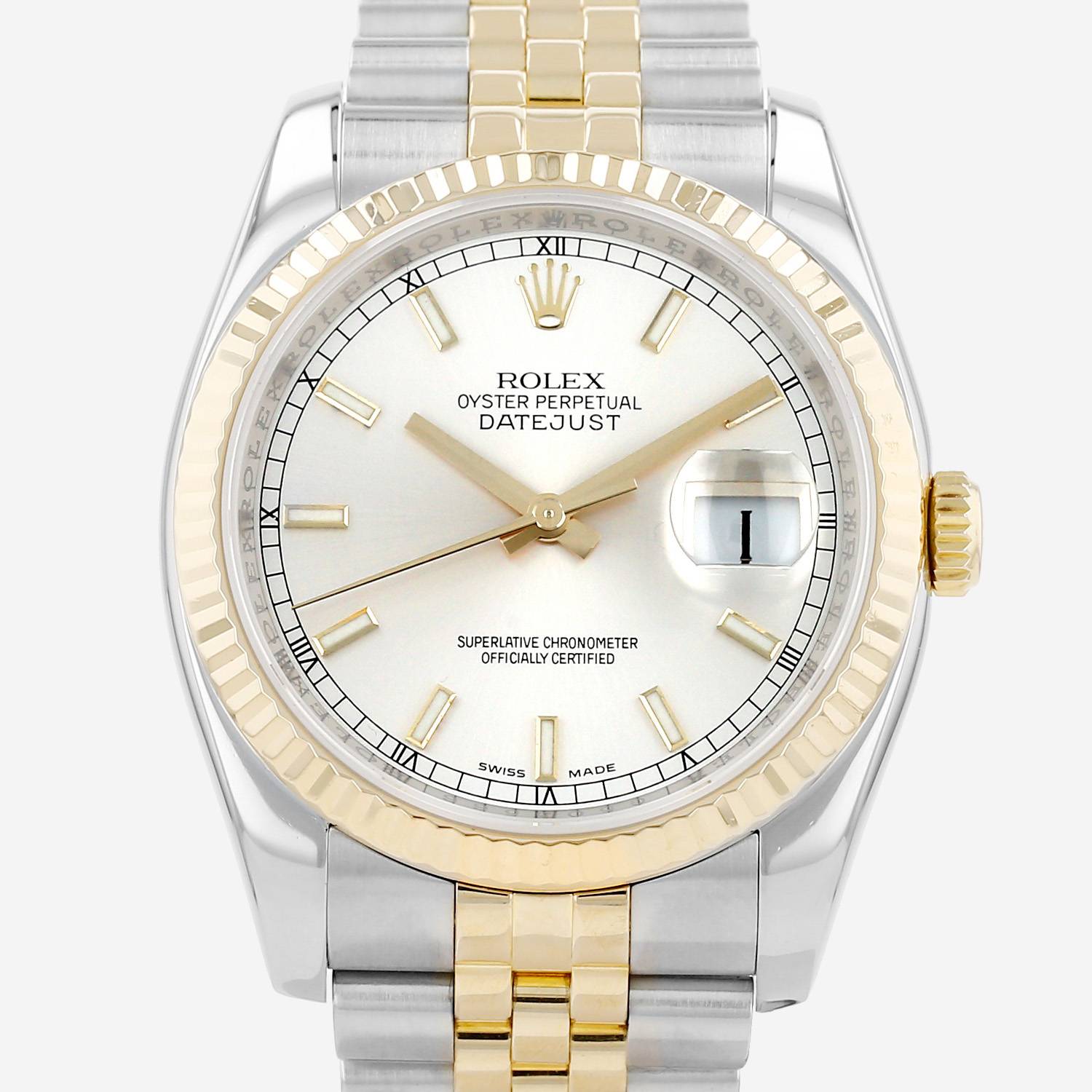 Reloj de pulsera Rolex Datejust de oro y acero. Caja de reloj redonda de oro y acero, fondo de caja enroscado, bisel estriado de oro amarillo, corona enroscada.