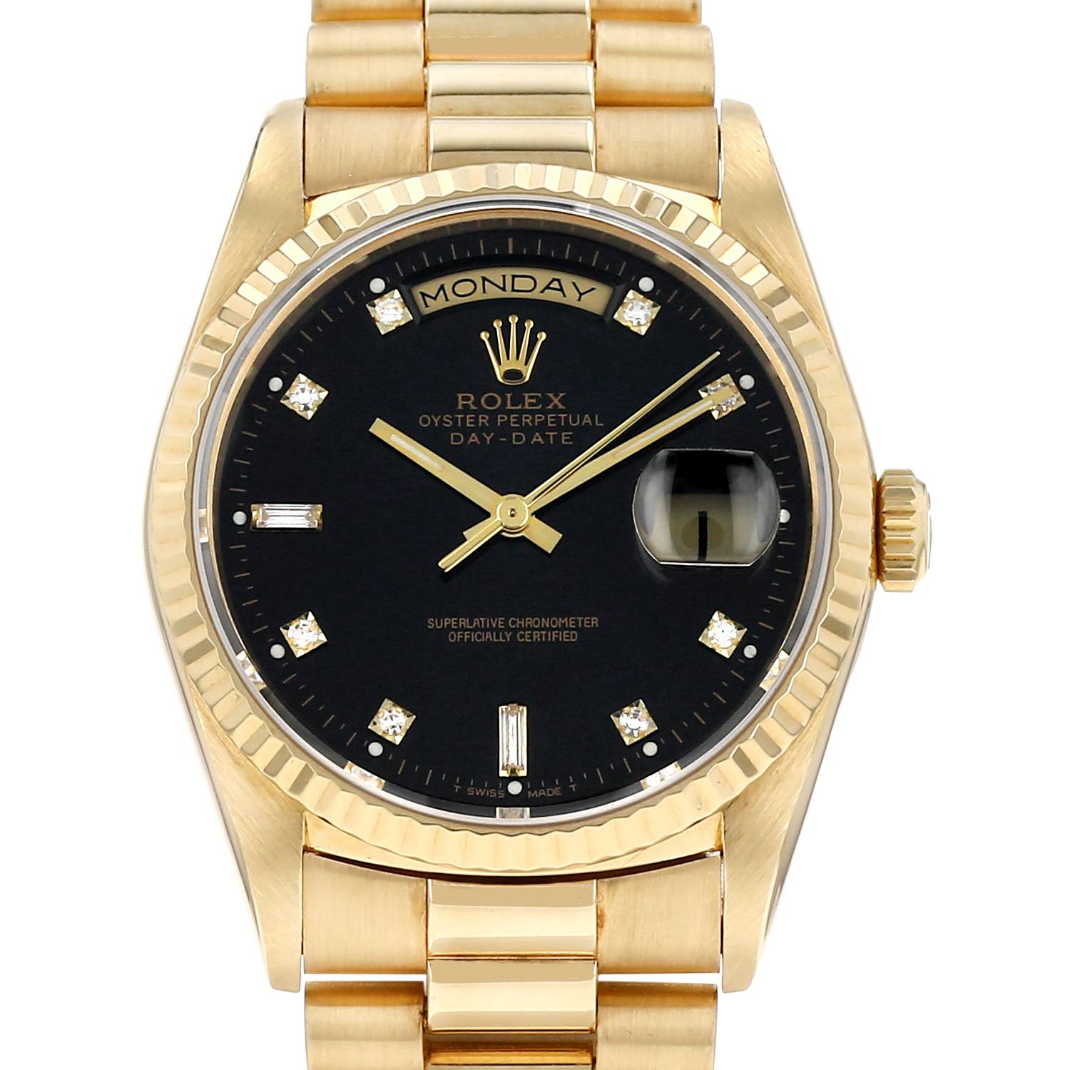 Reloj de pulsera Rolex Day-Date de oro amarillo. Caja de reloj redonda de oro amarillo, fondo de caja enroscado, bisel estriado de oro amarillo, corona enroscada.