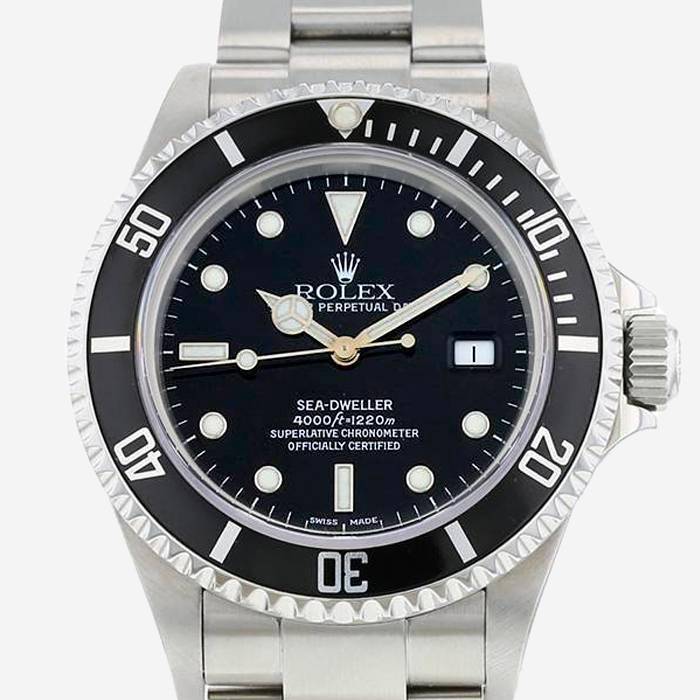 Reloj de pulsera Rolex Sea Dweller de acero. Caja de reloj redonda de acero, fondo de caja enroscado, bisel graduado giratorio unidireccional, corona enroscada.