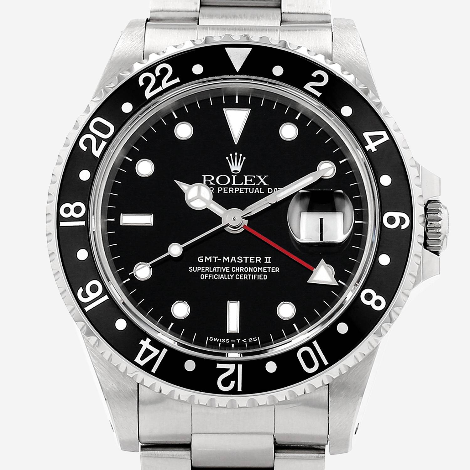 Reloj de pulsera Rolex GMT-Master II de acero. Caja de reloj redonda de acero, fondo de caja enroscado, bisel giratorio graduado 24h, corona enroscada.