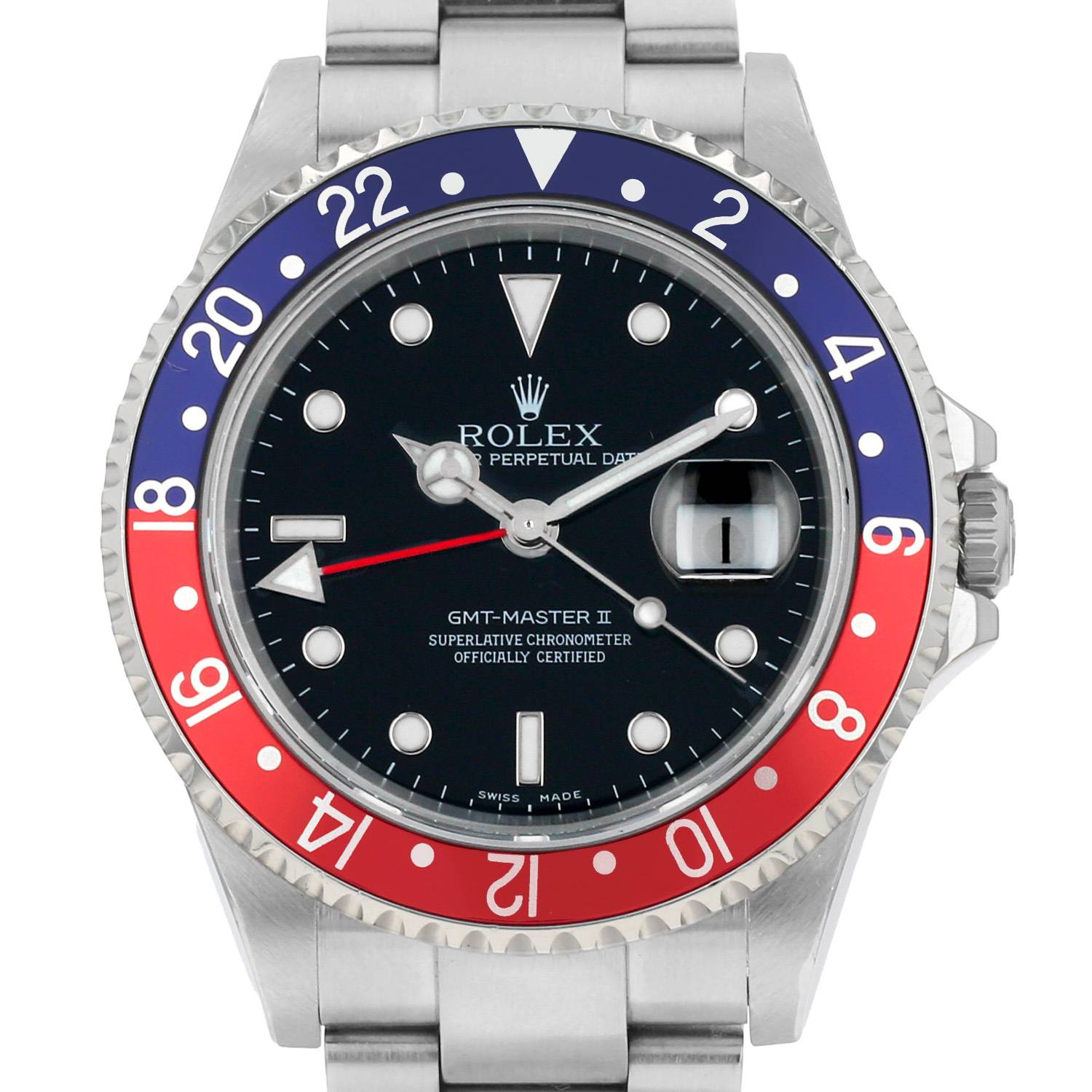 Reloj de pulsera Rolex GMT-Master II de acero. Caja de reloj redonda de acero, fondo de caja enroscado, bisel giratorio graduado 24h, corona enroscada.