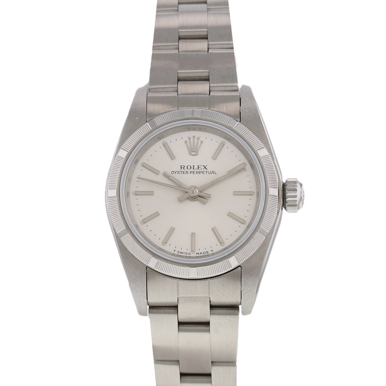 Reloj de pulsera Rolex Lady Oyster Perpetual de acero. Caja de reloj redonda de acero, fondo de caja enroscado, bisel semiestriado de acero, corona enroscada.