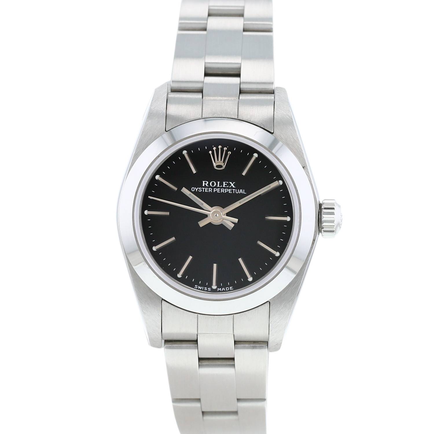 Reloj de pulsera Rolex Lady Oyster Perpetual de acero. Caja de reloj redonda de acero, fondo de caja enroscado, bisel liso de acero, corona enroscada.
