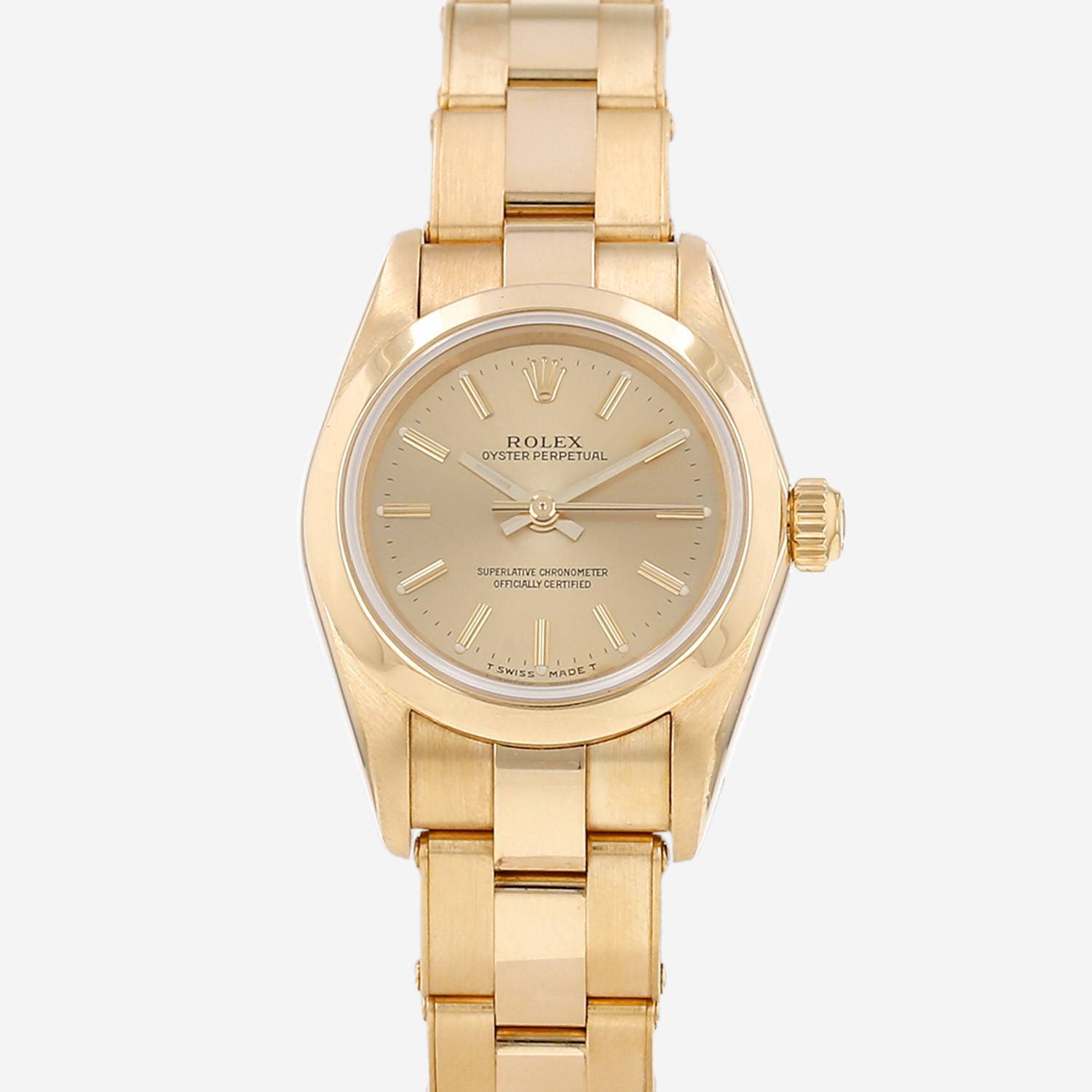 Reloj de pulsera Rolex Lady Oyster Perpetual de oro amarillo. Caja de reloj redonda de oro amarillo, fondo de caja enroscado, bisel liso, corona enroscada.