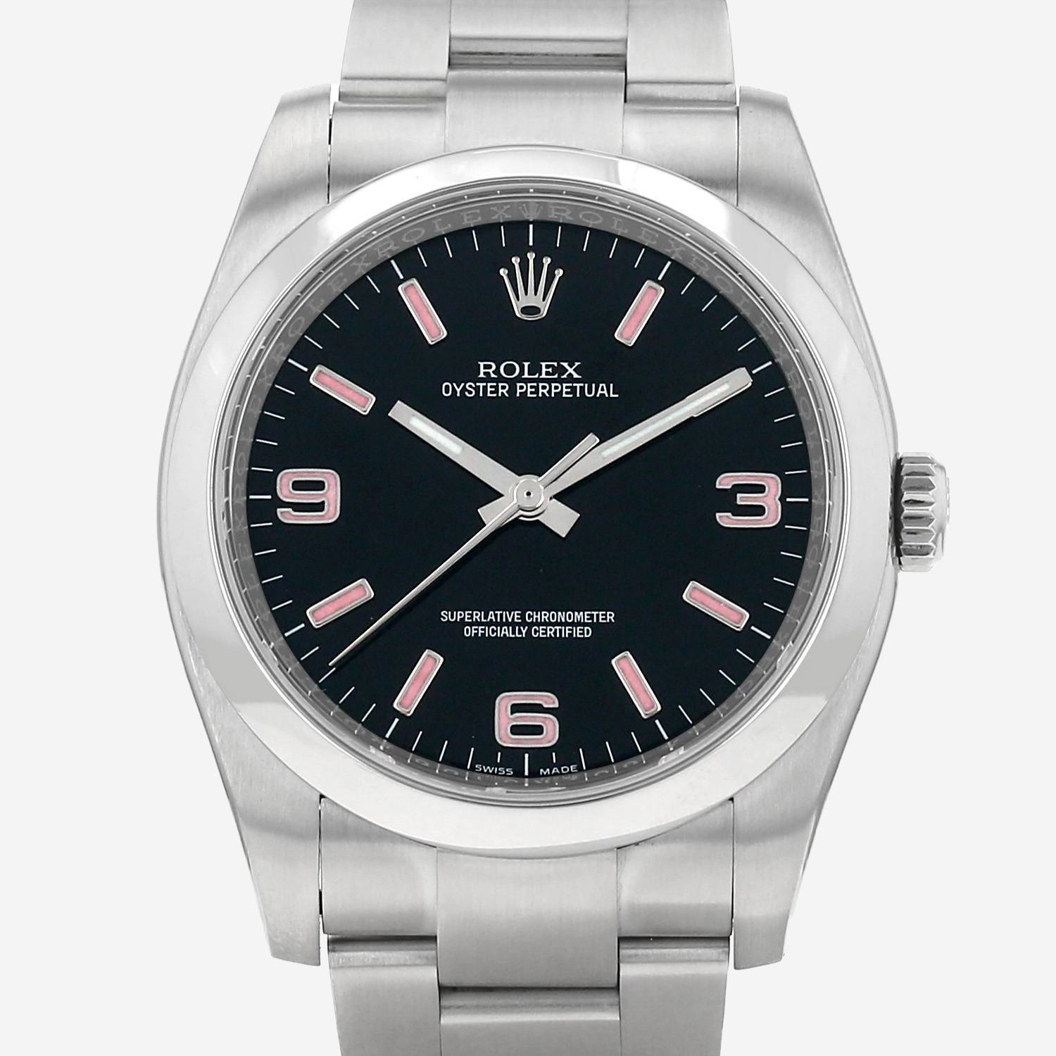 Reloj de pulsera Rolex Oyster Perpetual de acero. Caja de reloj redonda de acero, fondo de caja enroscado, bisel liso, corona enroscada.