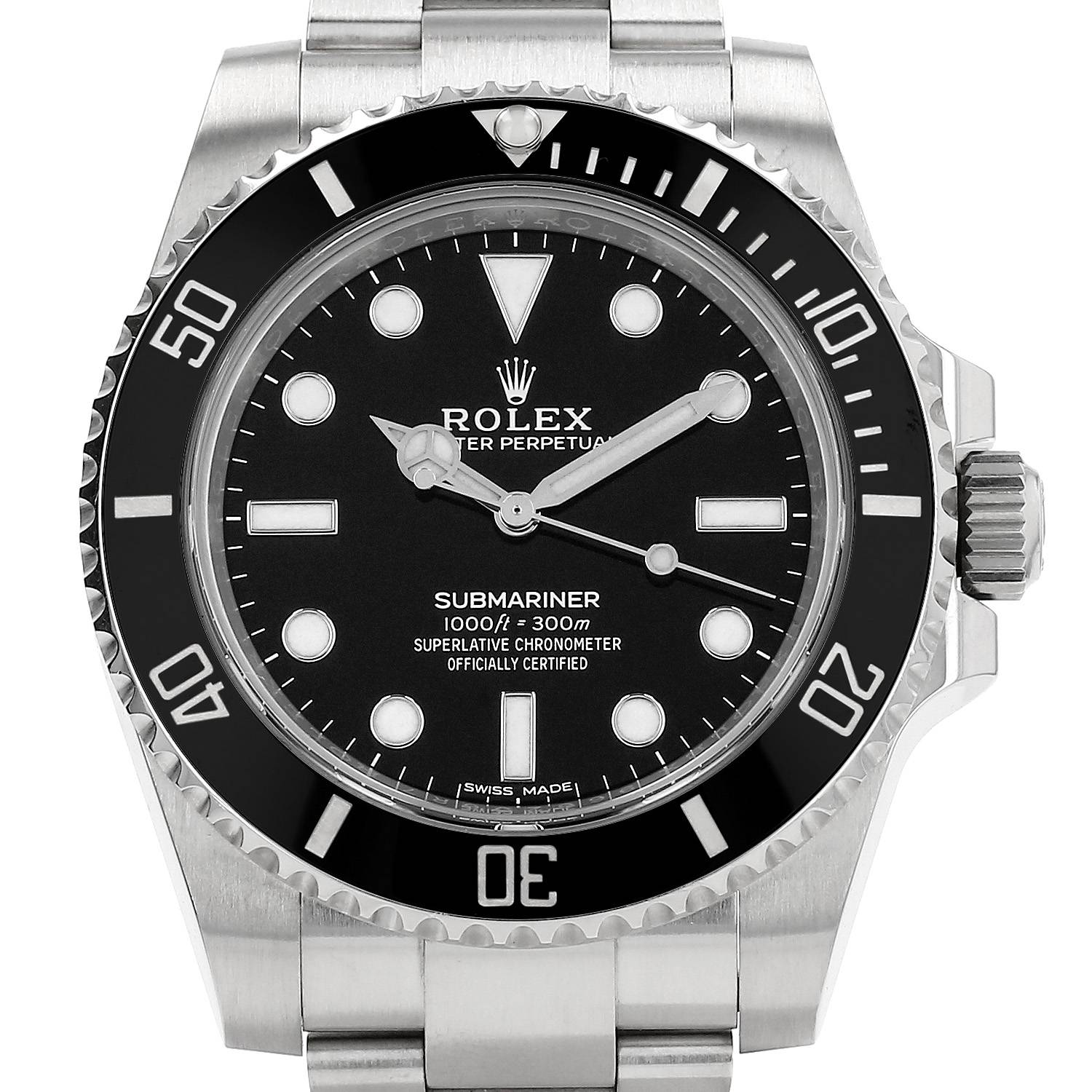 Reloj de pulsera Rolex Submariner de acero. Caja de reloj redonda de acero, fondo de caja enroscado, bisel graduado giratorio unidireccional, corona enroscada.